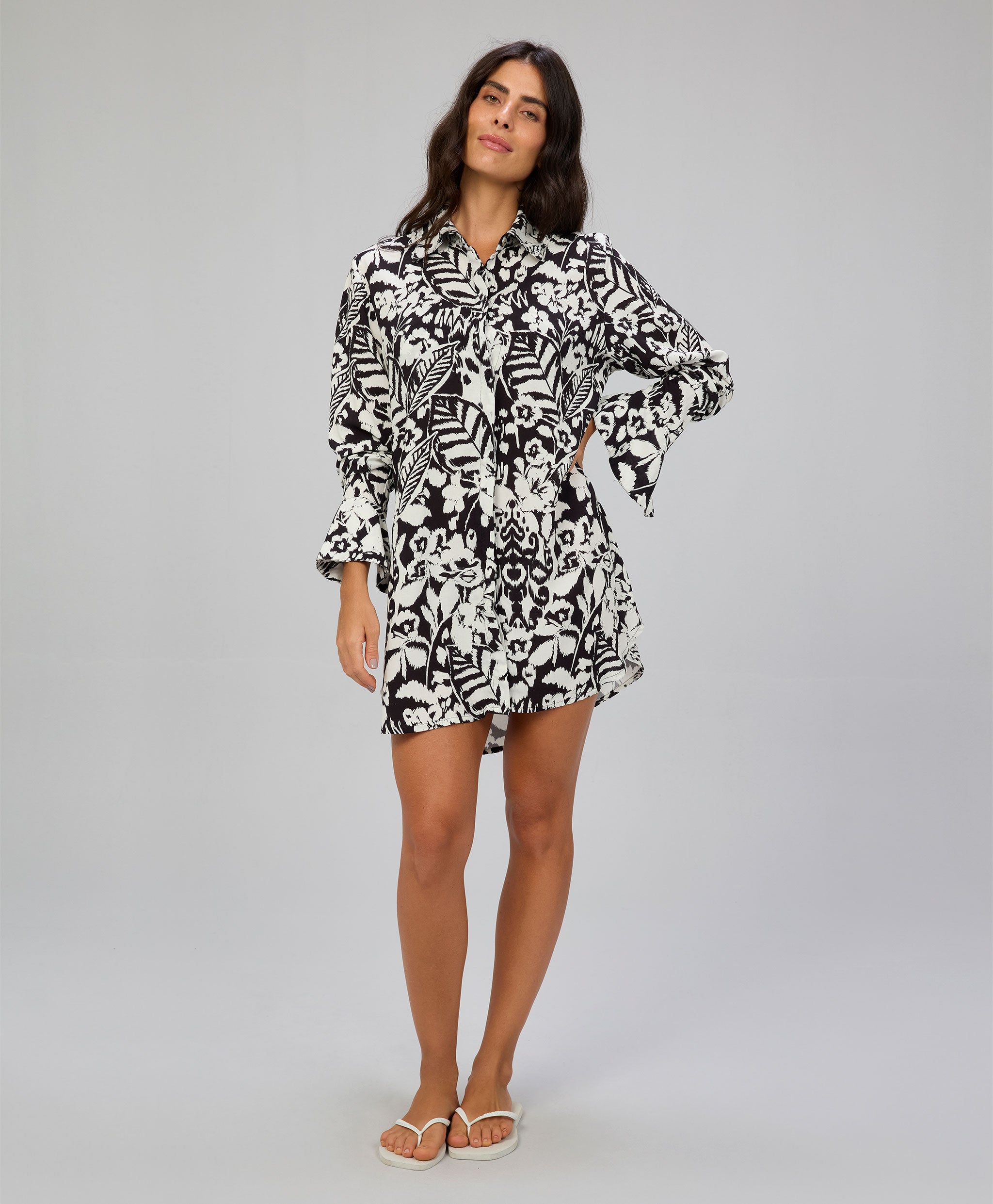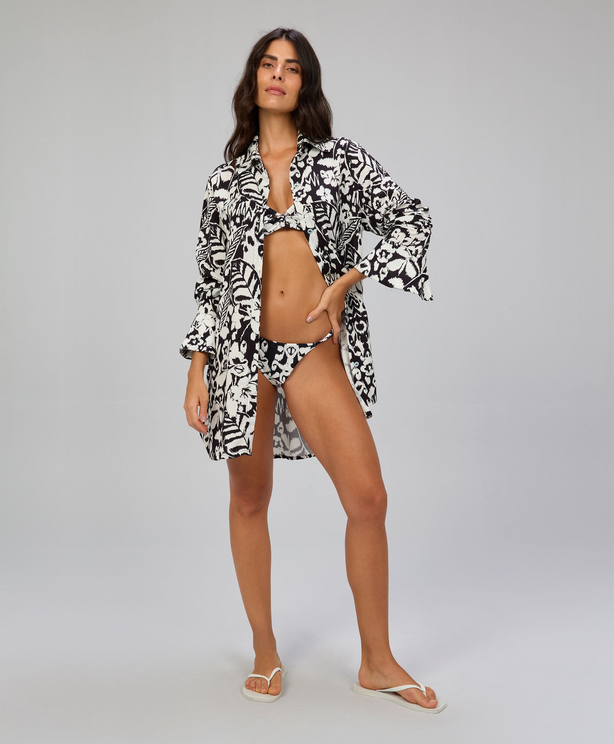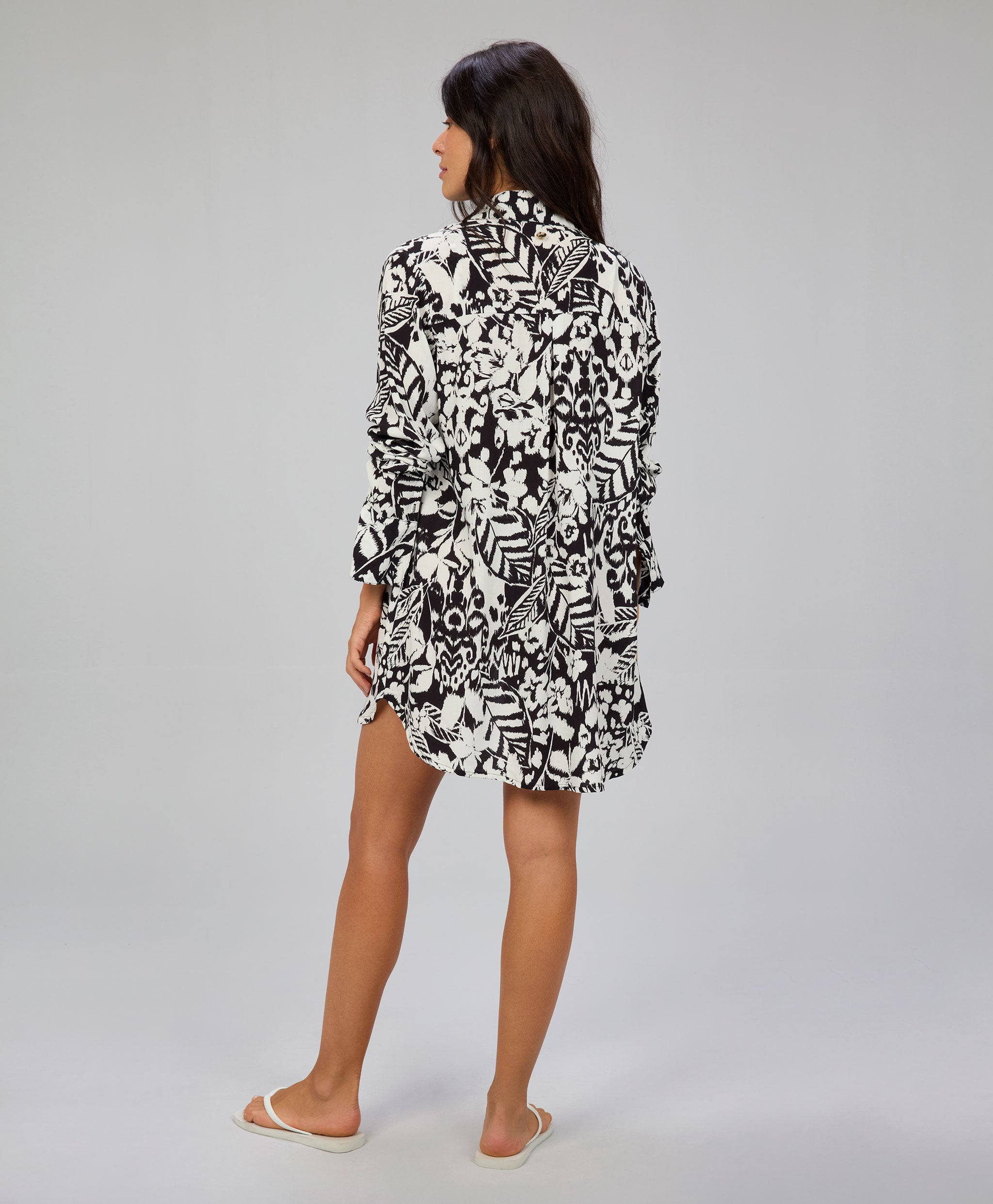 Saída de praia com modelagem camisão que oferece um visual casual e confortável, destacando detal...
