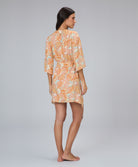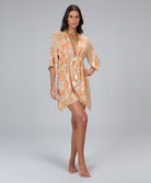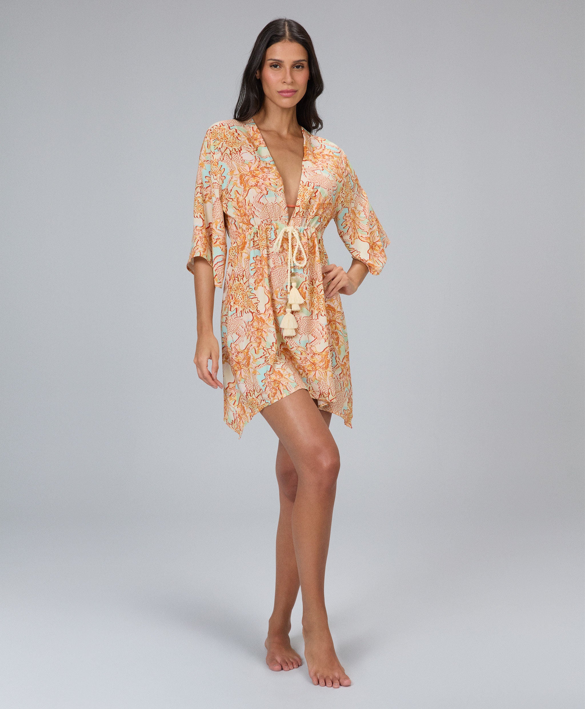 Saída kaftan de modelagem ampla que oferece conforto e liberdade de movimento, com recorte na cin...