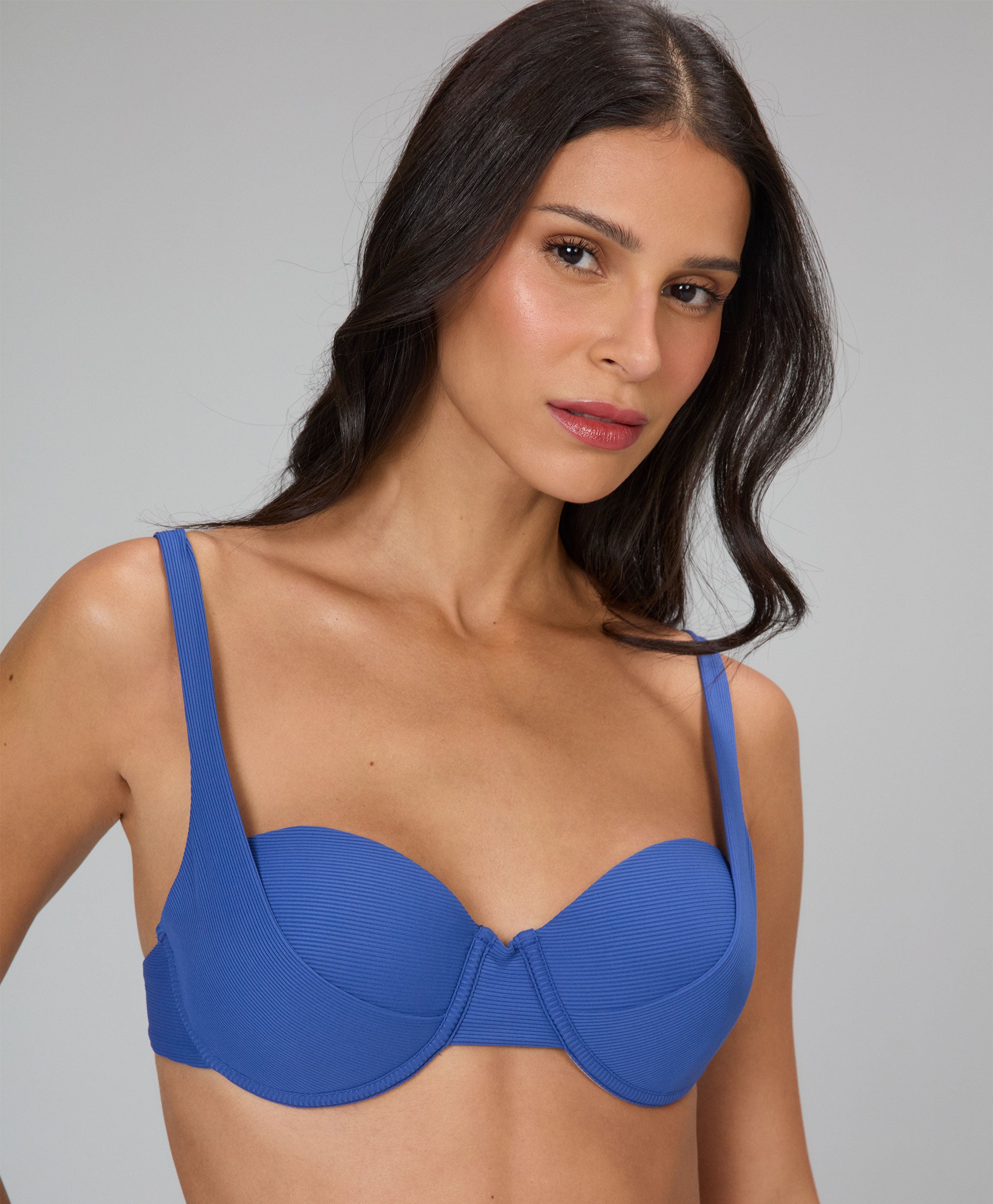 Biquíni meia-taça com bojo fixo e recorte de tecido sobreposto, confeccionado em tecido canelado ...