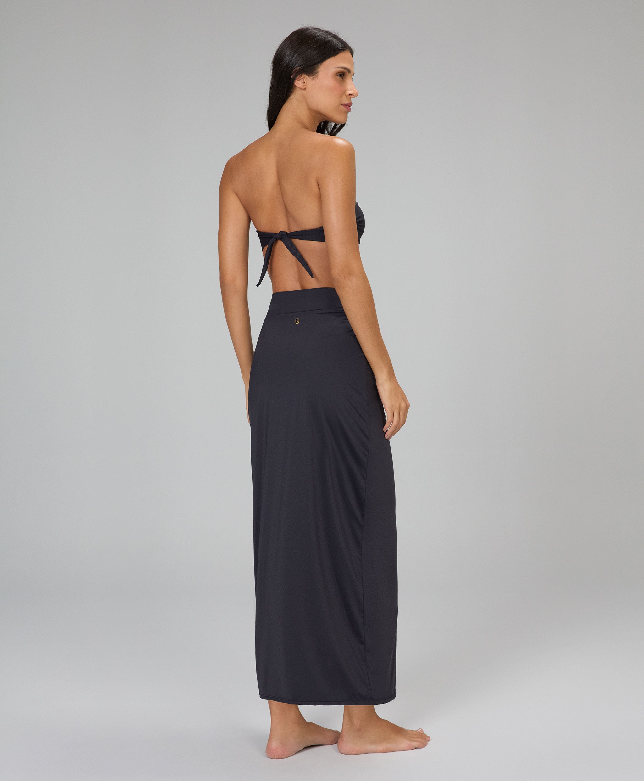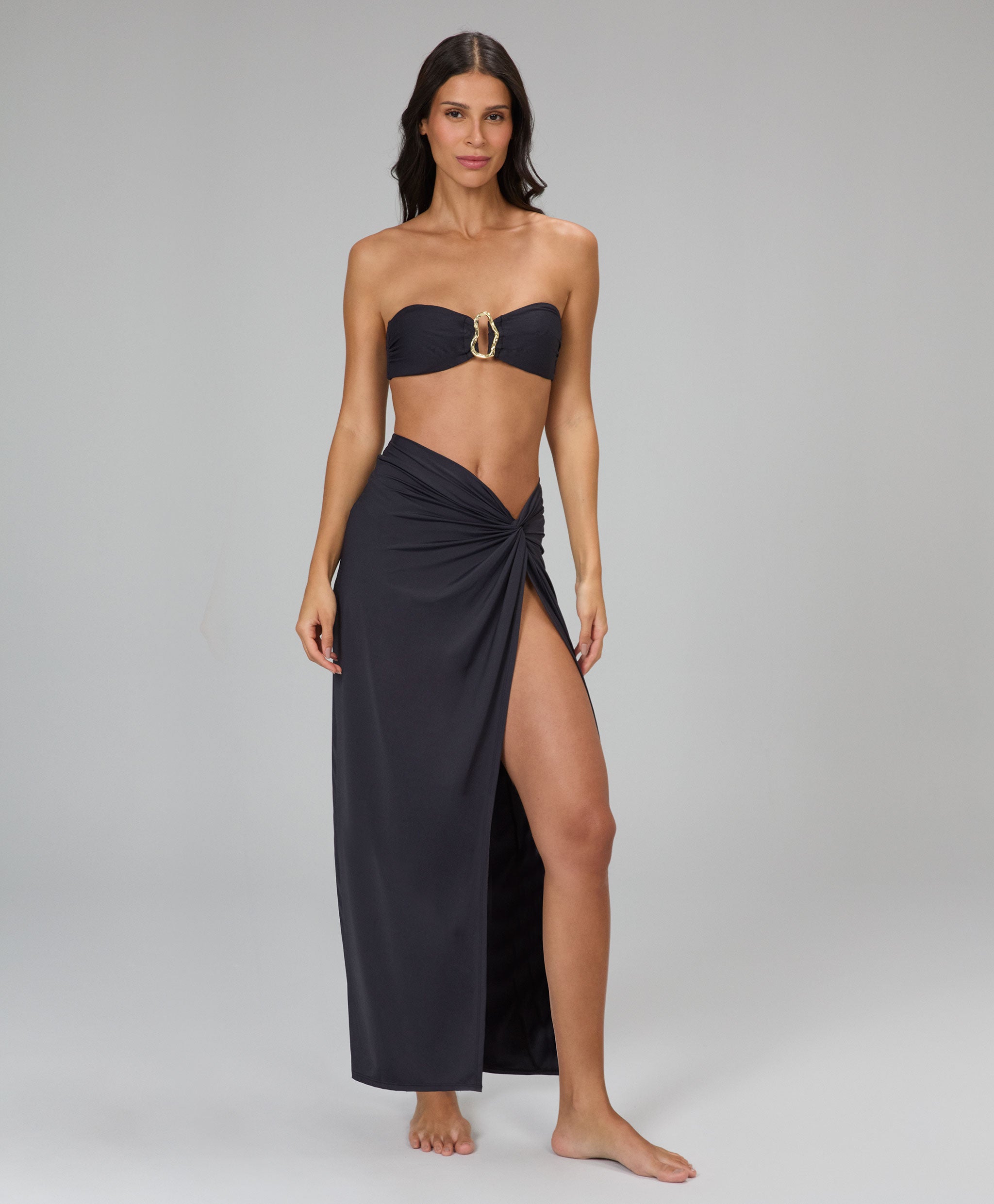 Saída de praia versátil com nó fixo na cintura que proporciona um caimento elegante e moderno, fe...