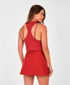 This cropped tank top combines a closed neckline and the freshness of the crossed sides, ensuring...
