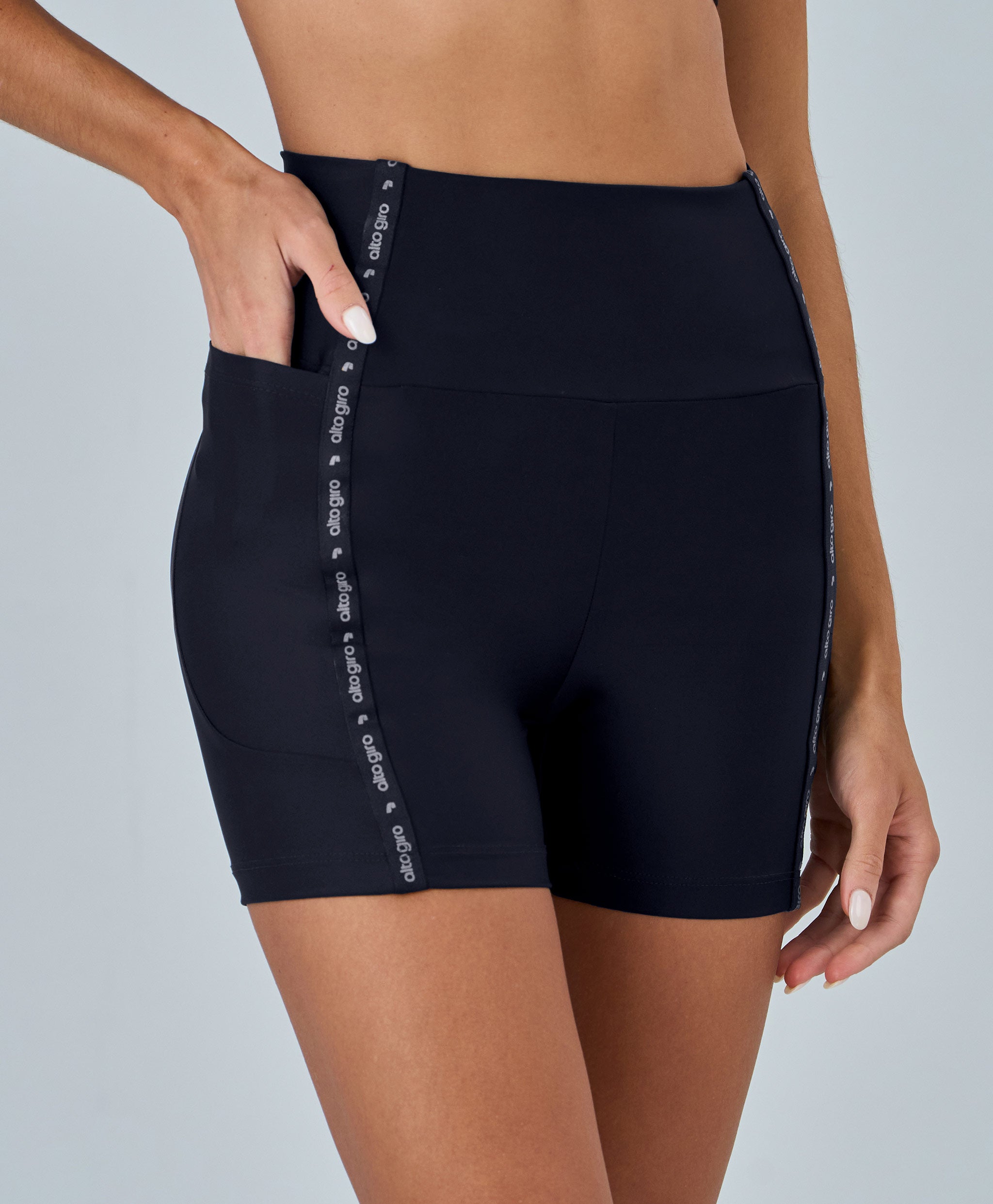 Bermuda Elástico Personalizado Alto Giro em tecido de alta compressão com proteção UV, oferecendo conforto e performance. Modelo de cós alto com bolso lateral e forro nas cores claras, garantindo praticidade e ajuste perfeito. Destaque para o elástico personalizado, que confere visual moderno e sofisticado à peça.