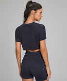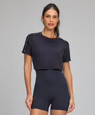 A T-Shirt Cropped Elástico Personalizado apresenta gola mais fechada e detalhes exclusivos de elá...