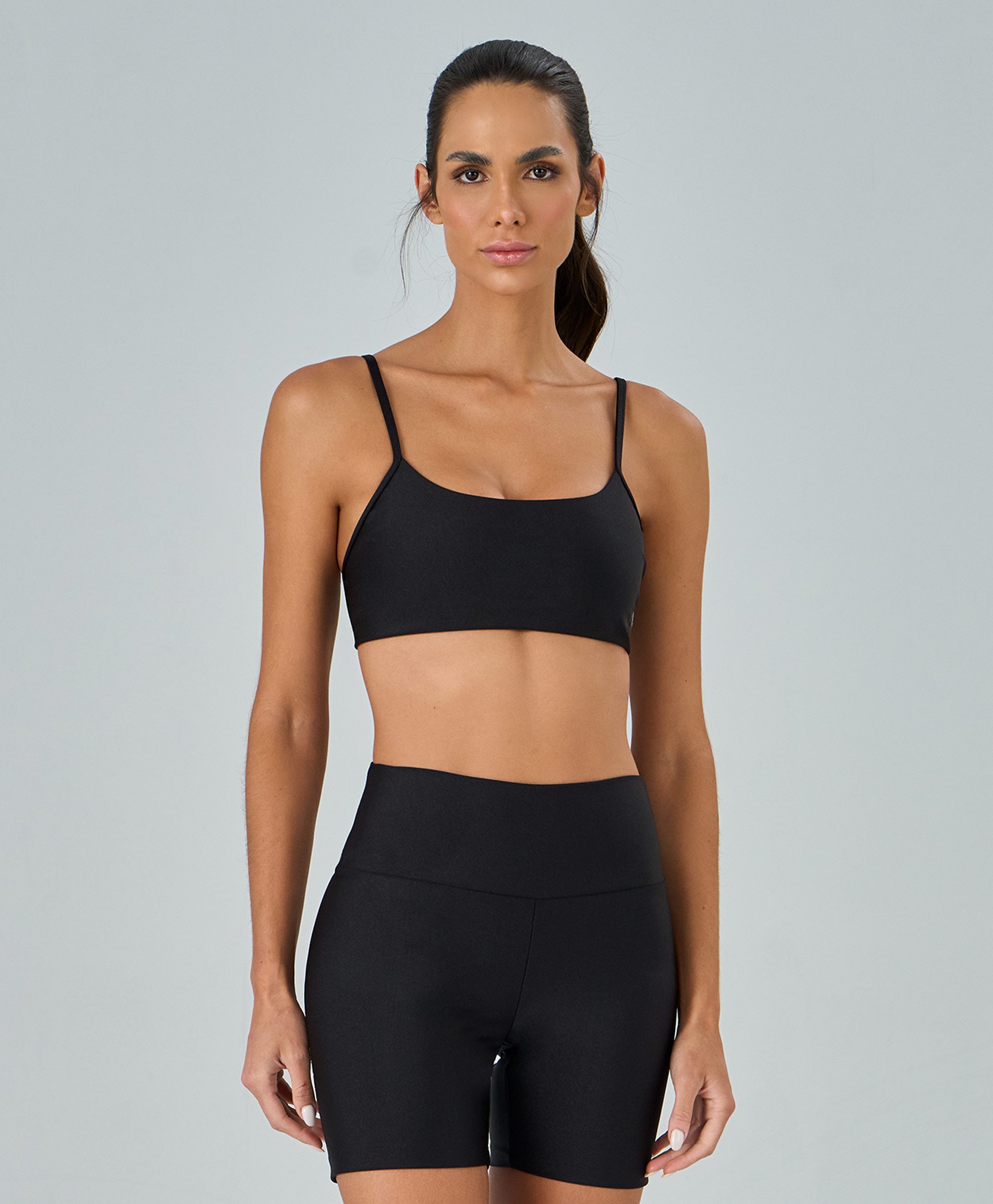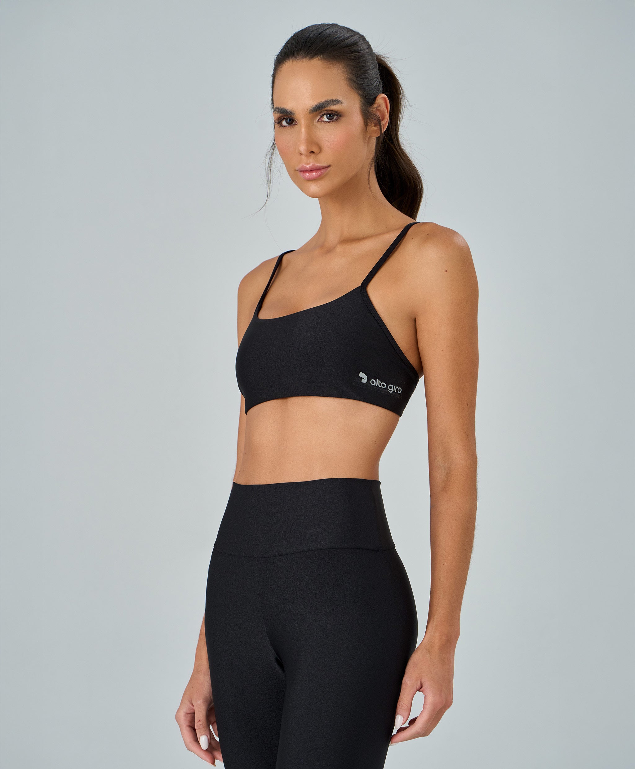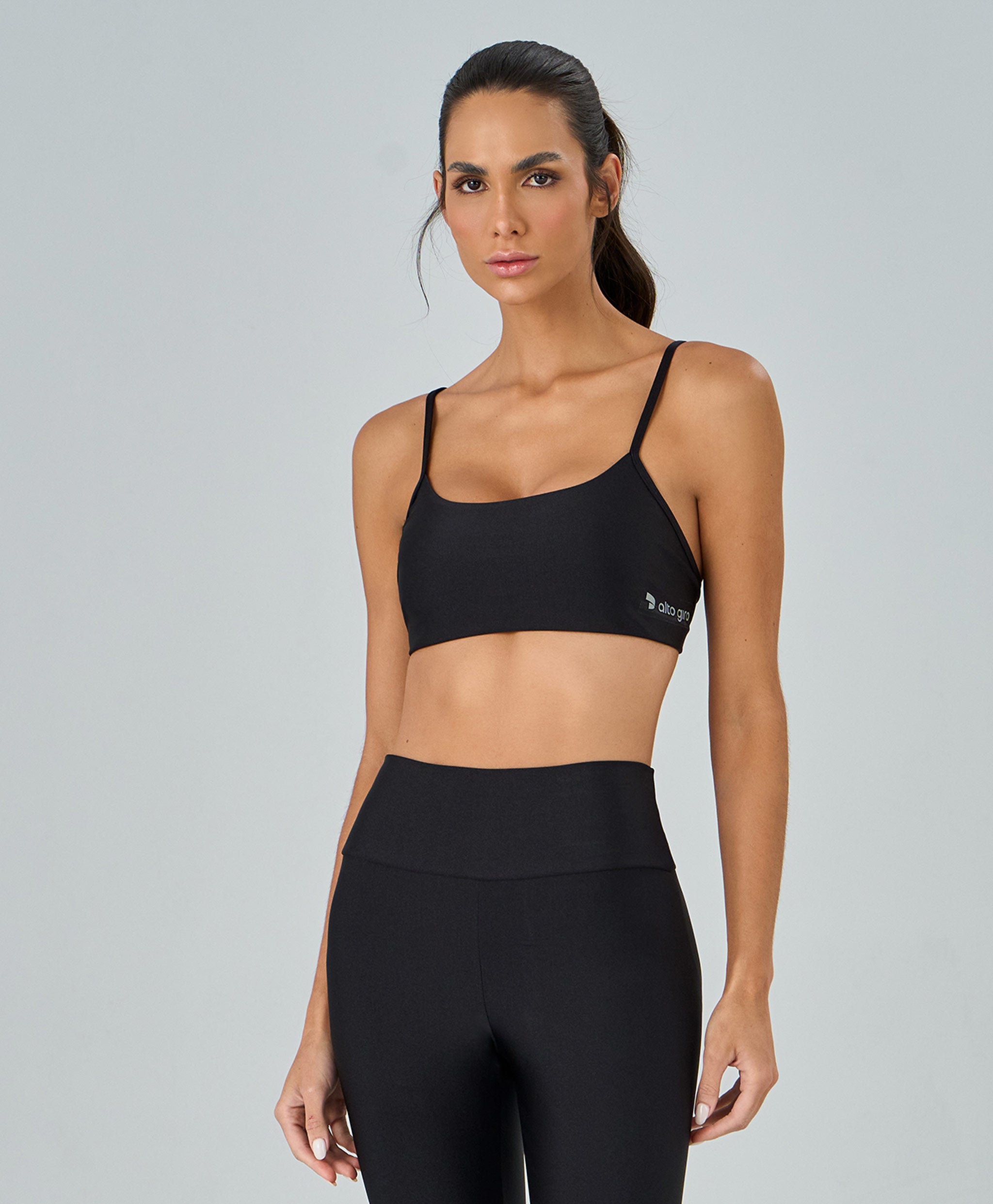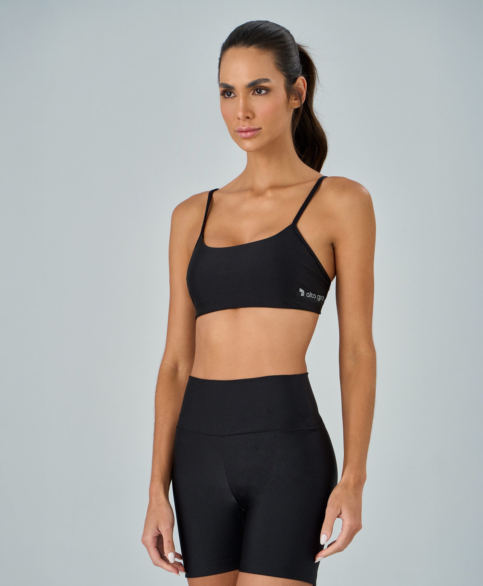 Top Shine Alças Finas confeccionado em tecido de lycra com fio brilhoso, oferecendo sofisticação, boa cobertura e toque macio. Modelo com decote baixo, costas baixas e alças finas que valorizam os ombros. Conta com bojo removível e elástico embutido no cós, garantindo sustentação e conforto. Detalhe refletivo com a logo Alto Giro na lateral adiciona modernidade e diferencial à peça.